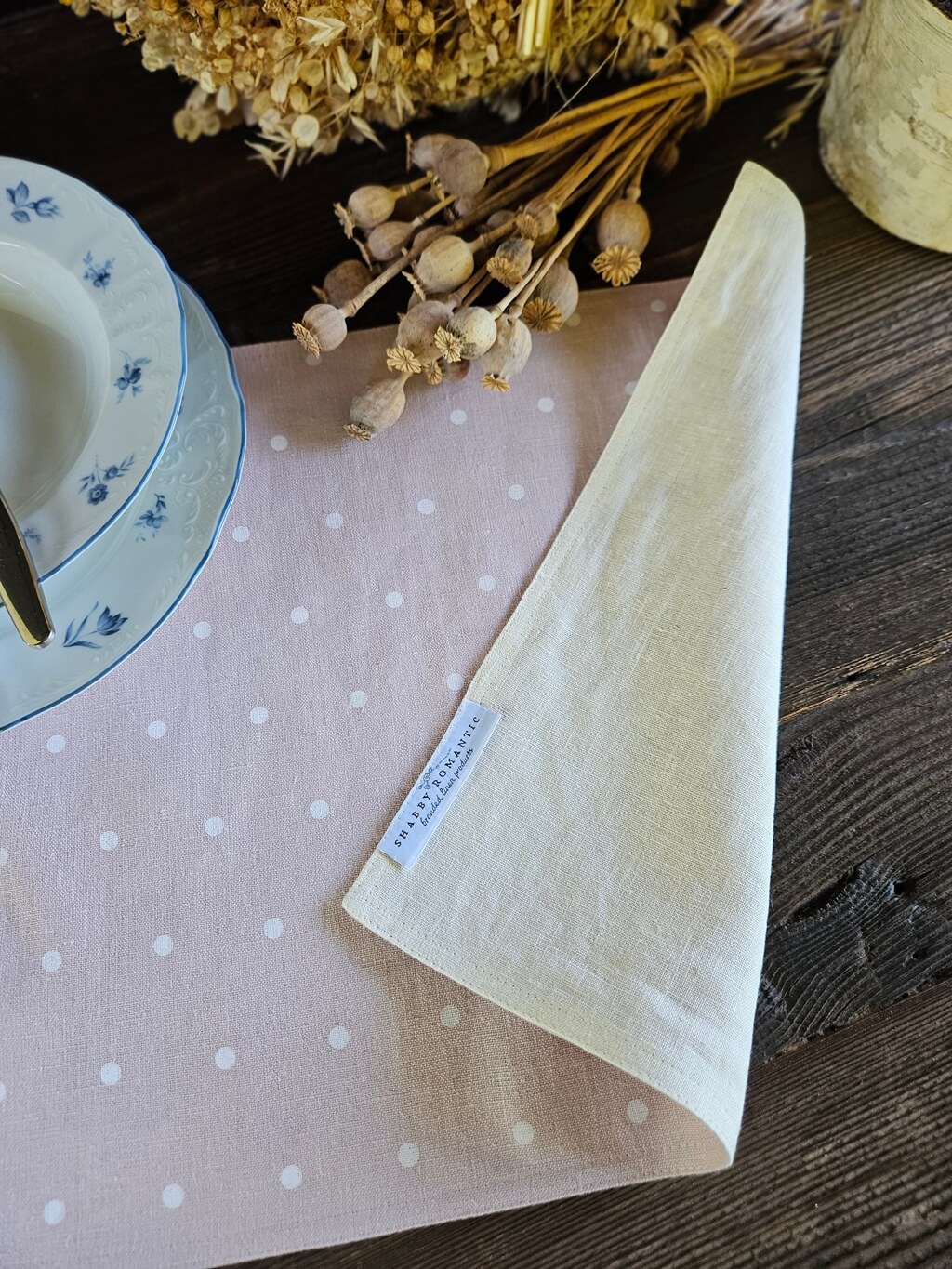 Přírodní len s bílými tečkami a pudrově růžová strana – jemnost a hravost v jednom kousku.