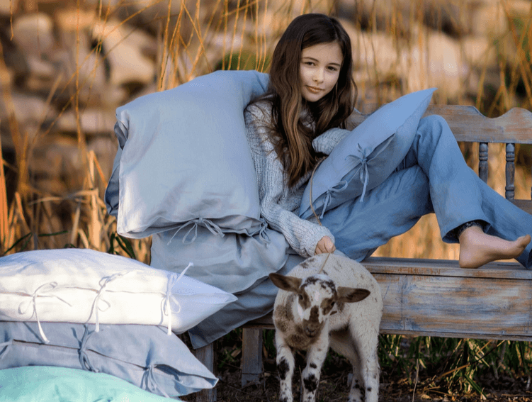Všechny produkty jsou vyrobeny z přírodního lnu, který je jemný k dětské pokožce, prodyšný a ideální pro zdravý spánek.