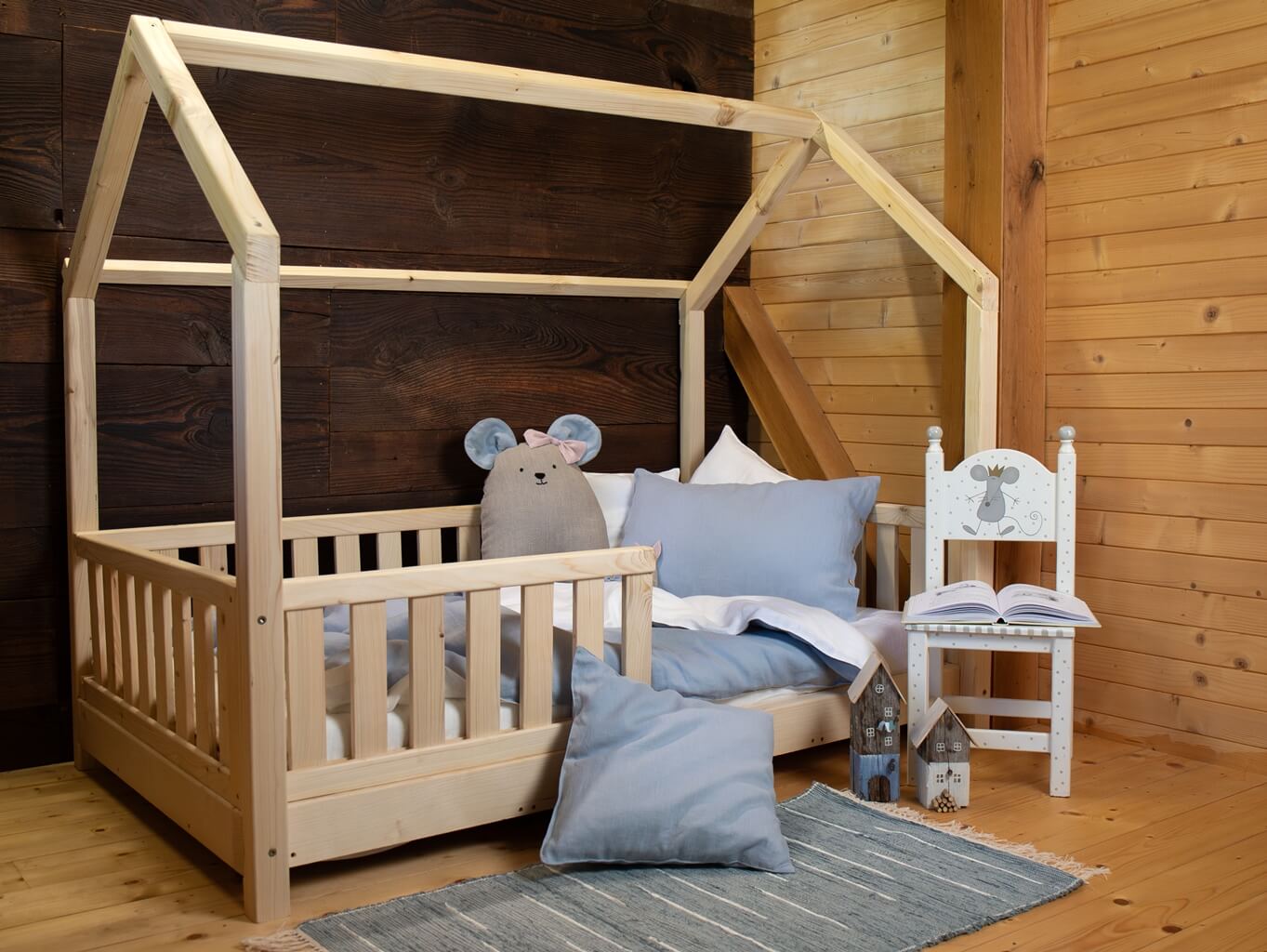 V postýlce je doplňuje velká lněná myška, která slouží jako měkká hračka i jako dekorační polštář.
