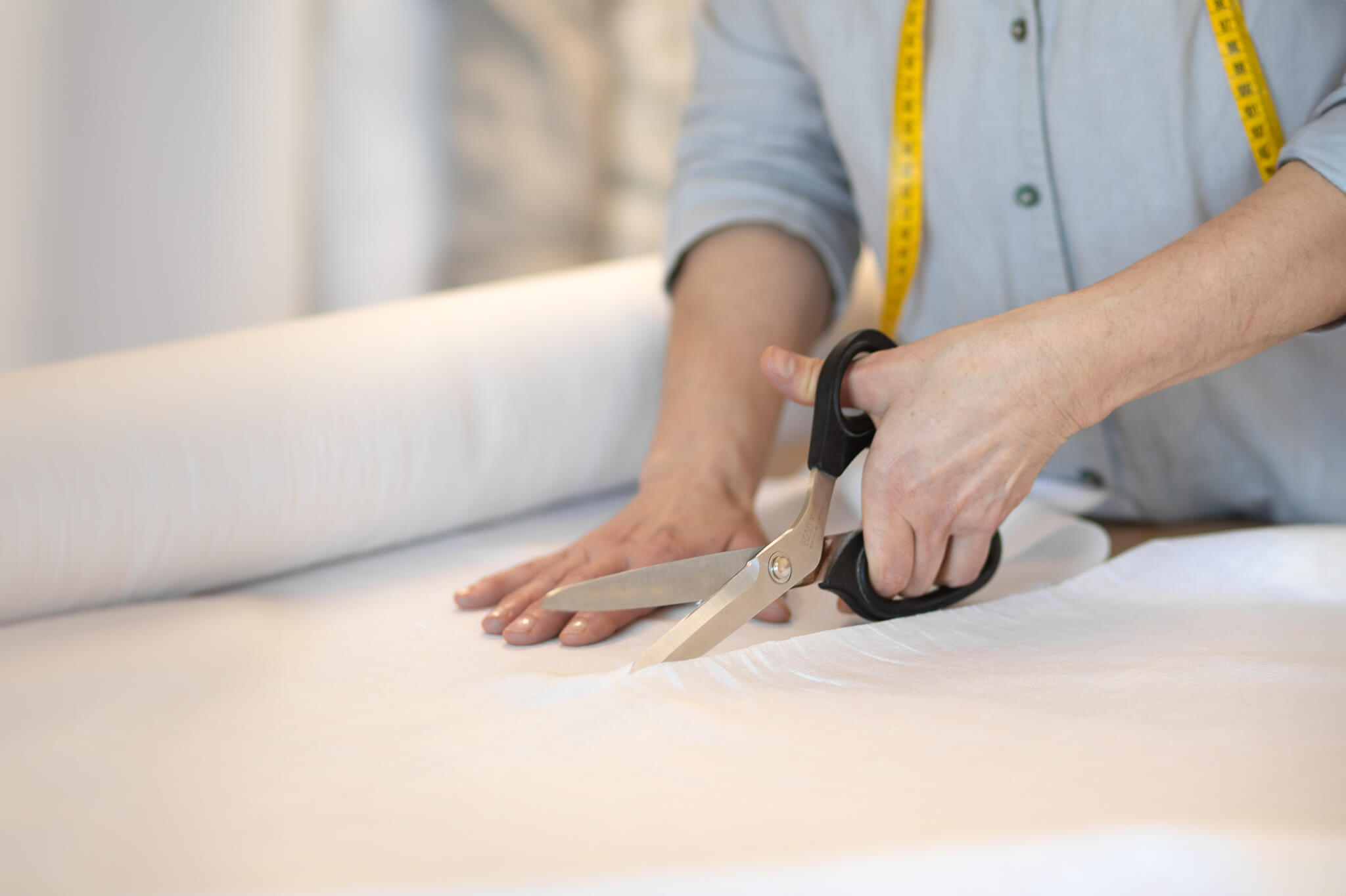 Látku stříháme ručně, bez použití řezaček. |