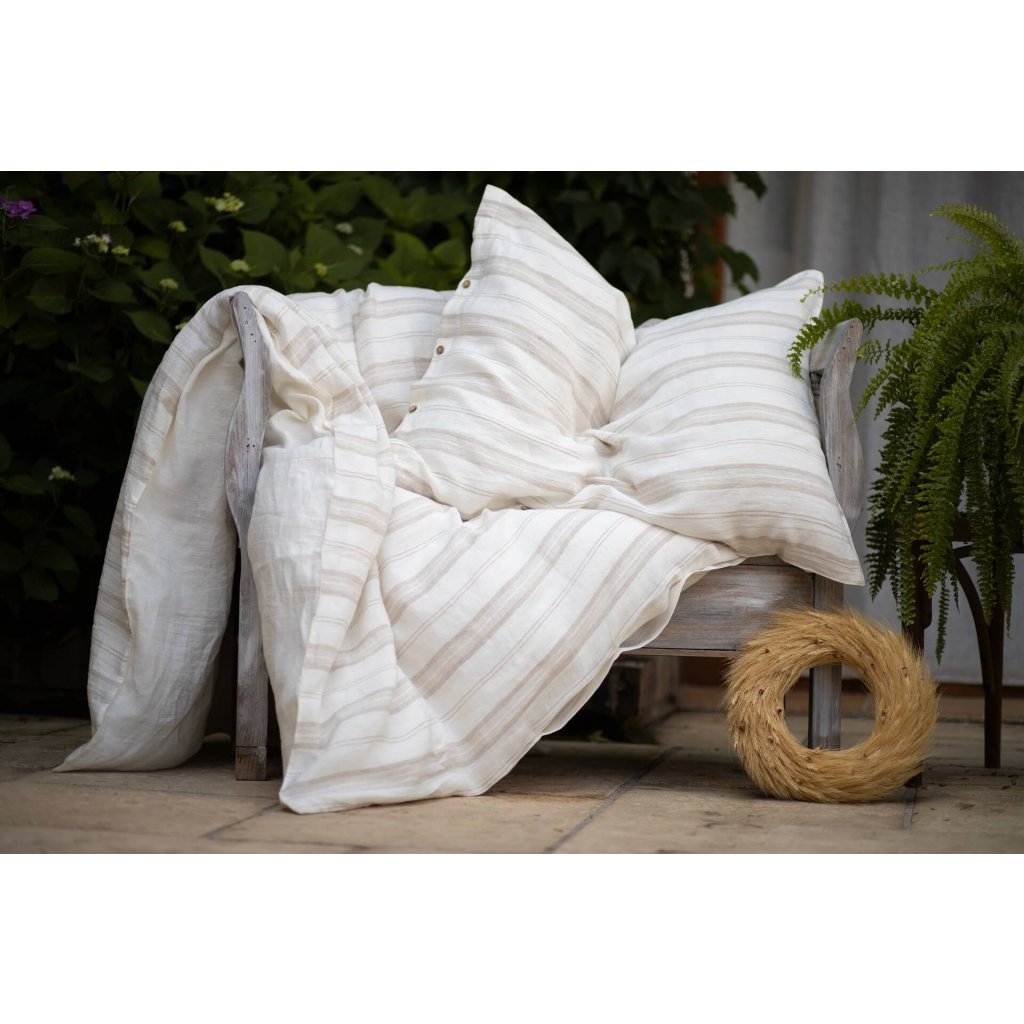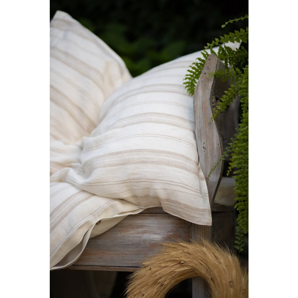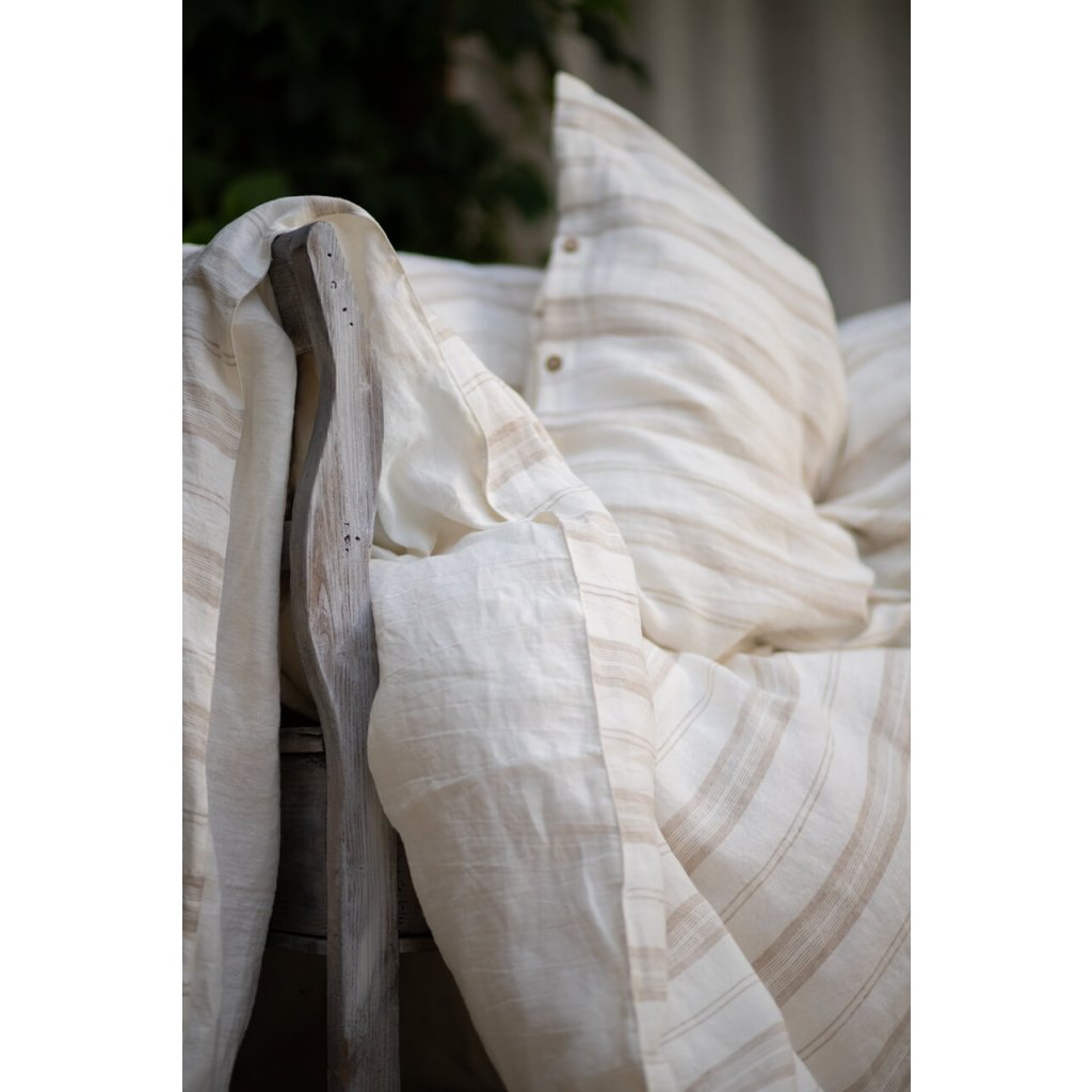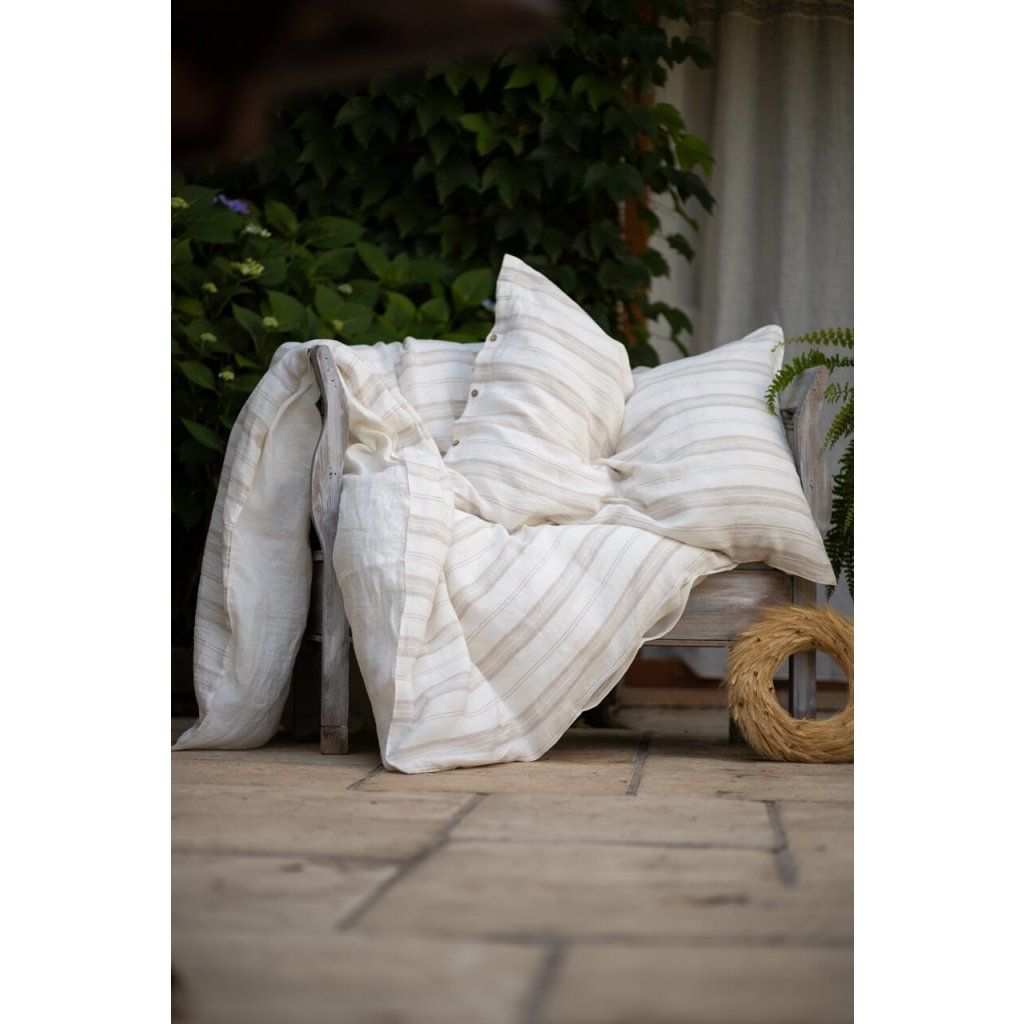 Přední strana povlaku na přikrývku a polštář je ušita ze lnu s proužkovaným vzorem.