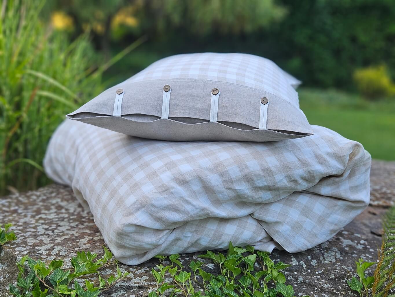 Toto povlečení je ušito z prémiového měkčeného lnu se vzorem čtverečků v přírodních barvách.