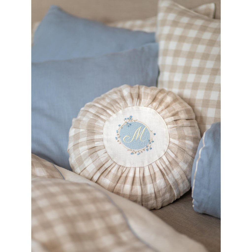 Polštář ve tvaru kruhu z kolekce Marie Antoinette jsem vytvořila zkombinováním lnu se čtverečky,