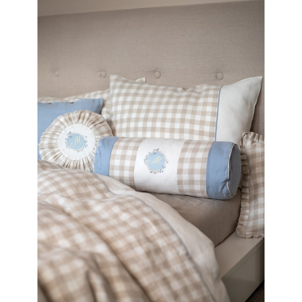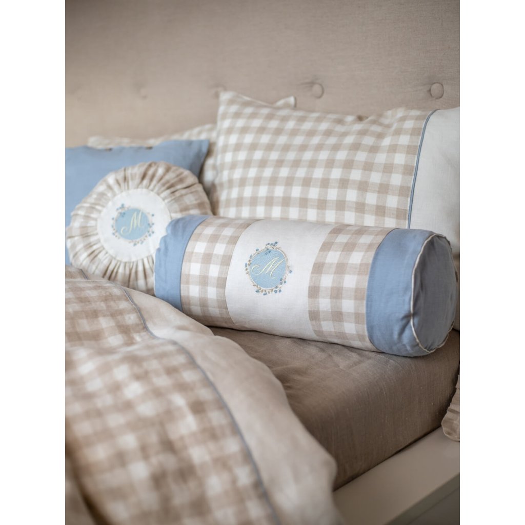 Polštář ve tvaru válce z kolekce Marie Antoinette jsem vytvořila zkombinováním lnu se čtverečky,