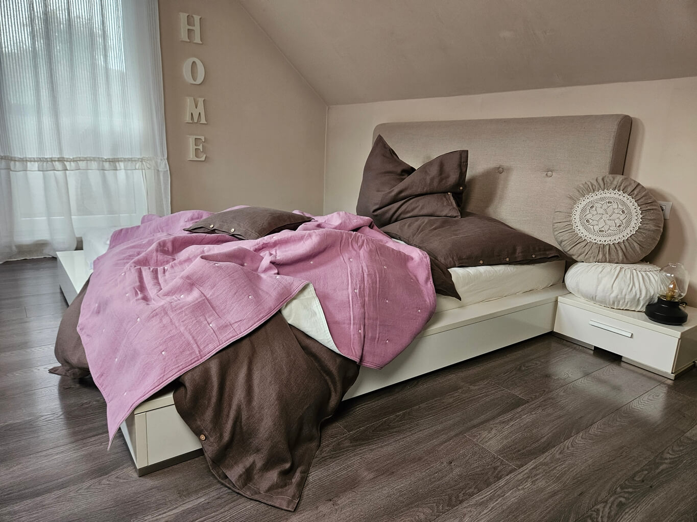 Lněná přikrývka Pink Lady je vyrobena ze dvou vrstev lnu, mezi které jsme vložili bavlněný vatelín.
