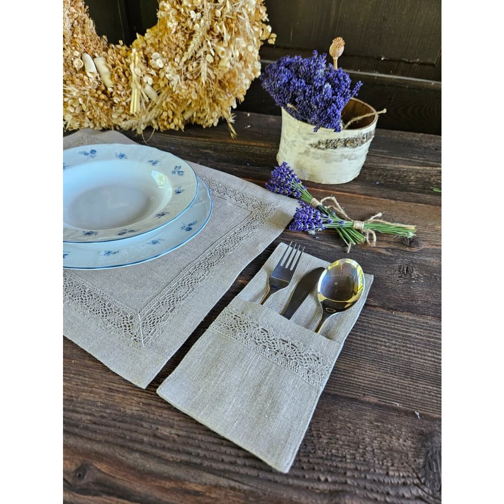 Použitý 100% len v barvě natur - režná. Prostírání je doplněno o vkusnou paličkovanou krajku.