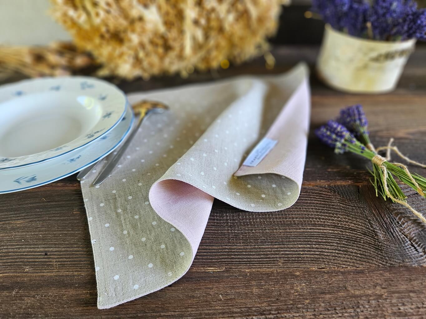 Z jedné přírodní len s drobnými bílými tečkami – jemný, hravý a přirozený, z druhé pudrově růžová,