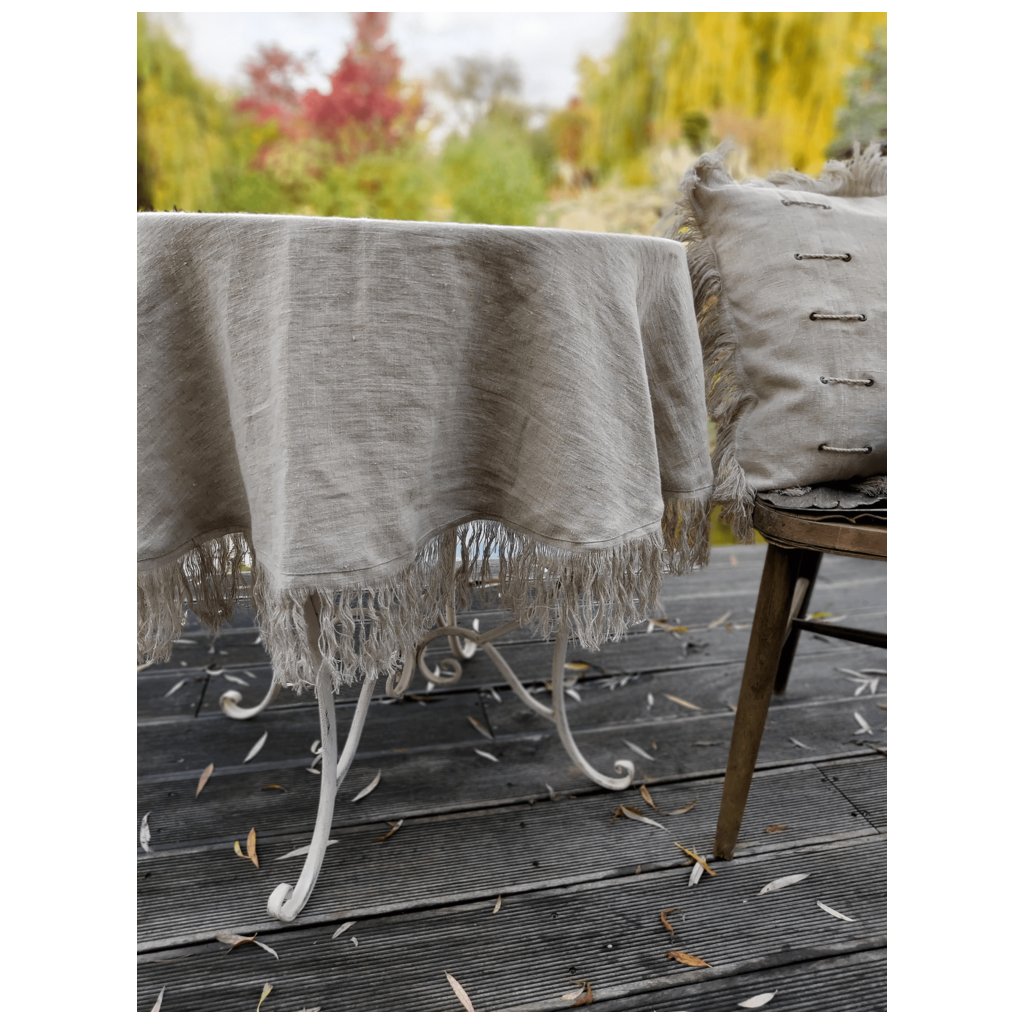 Ručně vytřepené konce po celém obvodu (cca 8 cm široké) umocňují dojem opotřebovanosti a dodávají obrusu drsný vzhled.